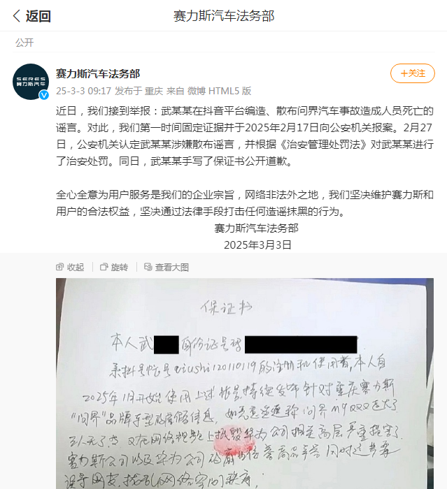 近日,我们接到举报:武某某在抖音平台编造、散布问界汽车事故造成人员死亡的谣言。对此,我们第一时间固定证据并于2025年2月17日向公安机关报案。2月27日,公安机关认定武某某涉嫌散布谣言,并根据《治安管理处罚法》对武某某进行了治安处罚。同日,武某某手写了保证书公开道歉。