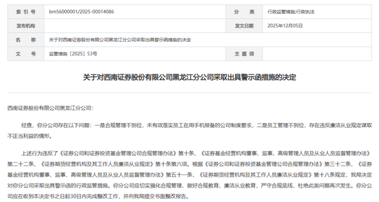 下发日期为2025年11月28日的〔2025〕53号监管函,点名西南证券黑龙江分公司存在两项违规: